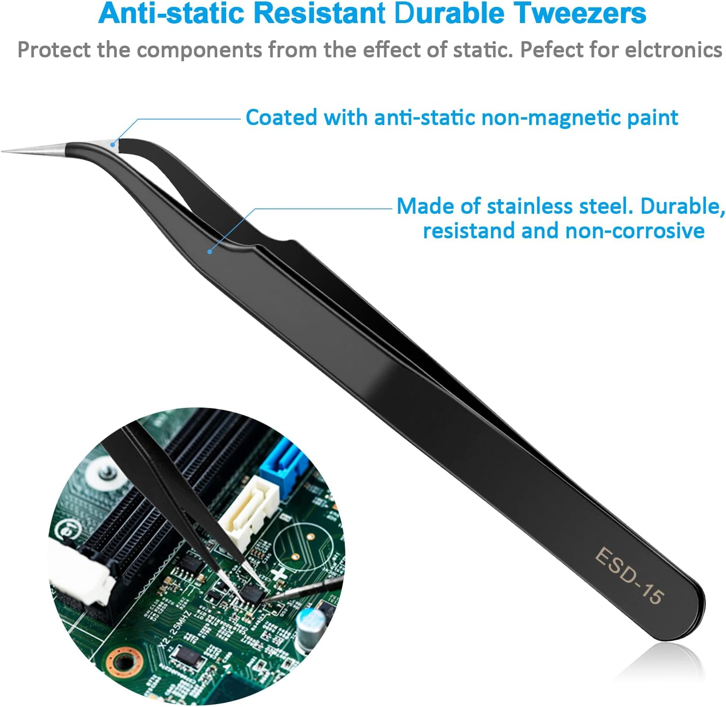 - 【 Antistatic, Resistant and Non Corrosive 】 — Precision electronics tweezers Set is made of durable stainless steel with anti-static paint on the surface and is resistant to most acids and other corrosive substances. You will like these ESD precision tweezers !