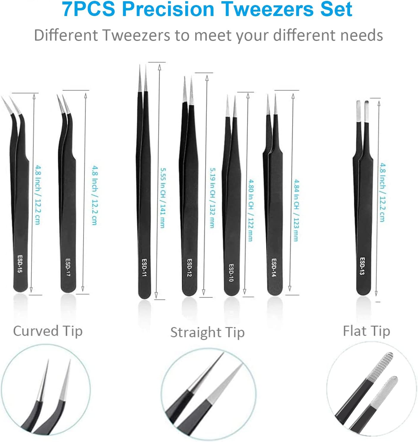 - 【 7PCS Precision Tweezers. Meet Your Different Needs 】 — This electronics ESD tweezers set has 7PCS different tweezers to meet your different needs. These tweezer can be widely applied to PCB, repairing of watches, crafts, jewelry, electronics, laboratory work and so on.