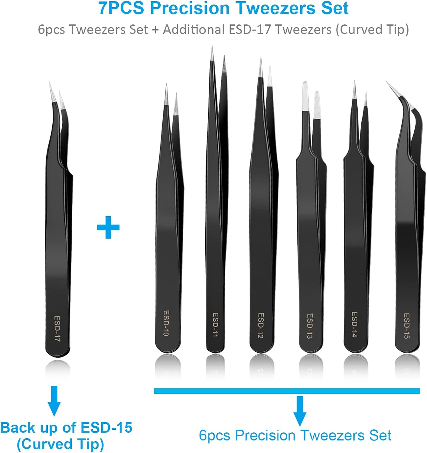 - 【 Additonal ESD-17 ESD Precision Tweezer 】 — Compared to other tweezer set, you will find our tweezer set includes additional ESD-17 tweezer. We find only one tweezer with curved tip can not meet our need, so we add aditional ESD-17 esd precise tweezer. More Tweezers, more convenient.